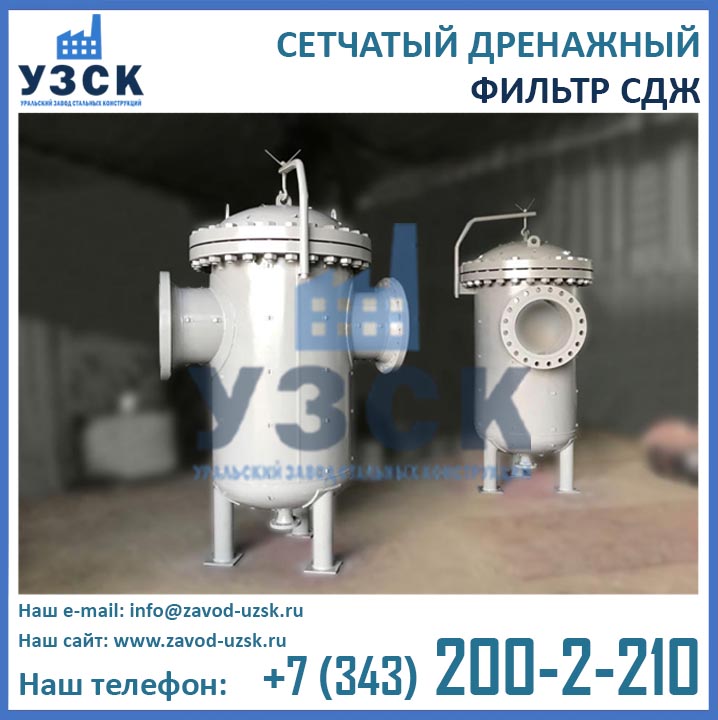 На формирование цены дренажного фильтра влияют следующие факторы: материальное исполнение, конструктивное исполнение, стоимость сырья в момент изготовления, комплектация, необходимость доставки в другой населенный пункт, срочность выполнения работ по изготовлению, прочие предпочтения заказчика. Уральский завод стальных конструкций изготавливает фильтры СДЖ-700 любого типового исполнения, а также нестандартные фильтры СДЖ 700 мм по чертежам заказчика или техническому заданию. Дополнительно к фильтрам СДЖ у нас Вы можете заказать сменные фильтрующие элементы любой тонкости фильтрации, ответные фланцы, прокладки и крепеж. По запросу изготавливаем также фильтры СДЖ-К-700 с концевым затвором. Для того чтобы узнать какова цена на фильтр СДЖ Ду700 в Шахтинске с необходимыми Вам характеристиками, отправьте запрос в отдел продаж завода УЗСК по координатам, указанным в разделе «Контакты».
